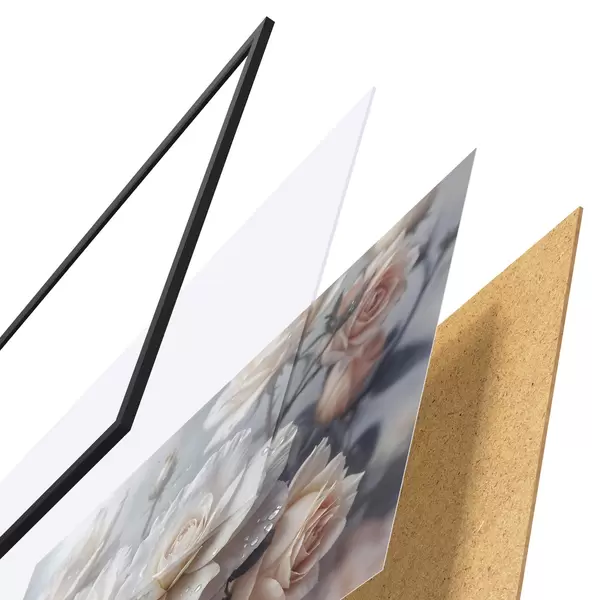 El póster consta de marco, plexiglás, imagen impresa y soporte de aglomerado. El póster puede colgarse inmediatamente en la pared gracias a los soportes de la parte posterior.