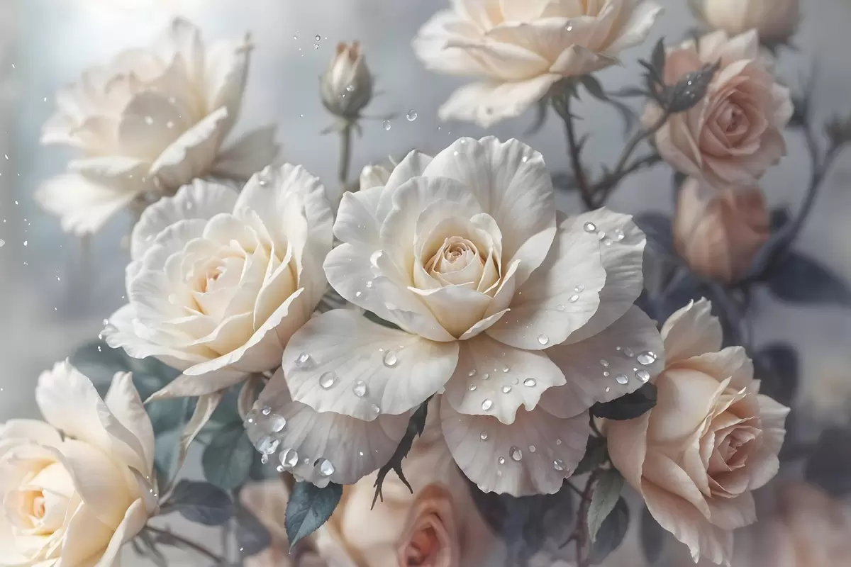 Poster Un grupo de rosas blancas con gotas de agua en los pétalos, algunas hojas verdes, fondo apagado, luz suave Nr f43163
