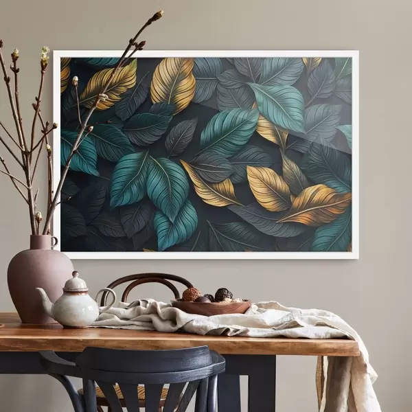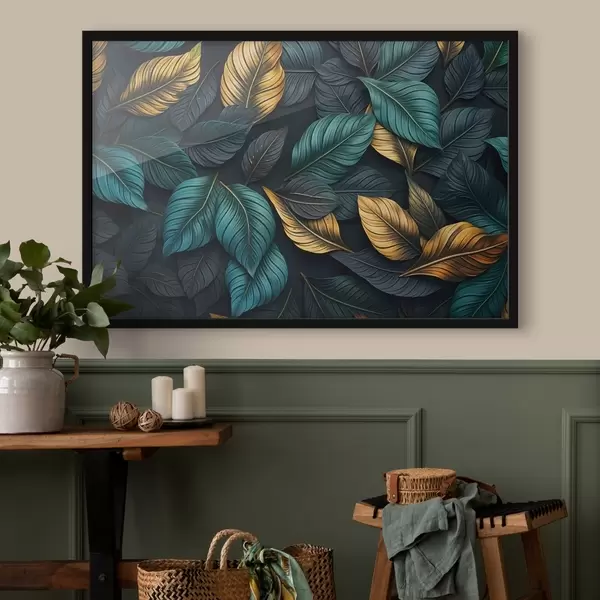 Poster Hojas verde oscuro, amarillo y negro con venas oscuras, en un fondo oscuro, elegante ambiente tropical Nr f43164