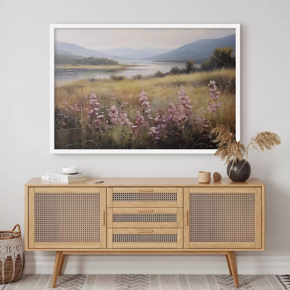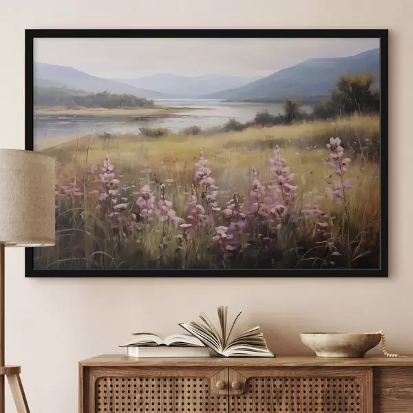 Poster Un paisaje con un campo de flores rosas, un lago y montañas al fondo, bajo un cielo nublado Nr f43165