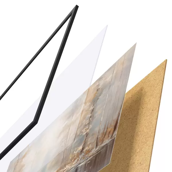 El póster consta de marco, plexiglás, imagen impresa y soporte de aglomerado. El póster puede colgarse inmediatamente en la pared gracias a los soportes de la parte posterior.