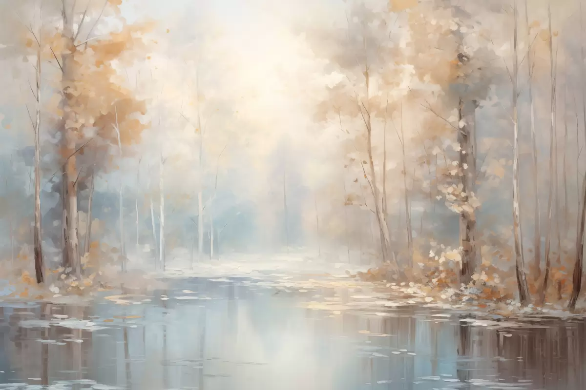 Poster Paisaje al óleo imitación de un río tranquilo que refleja la suave luz, rodeado de árboles otoñales Nr f43167