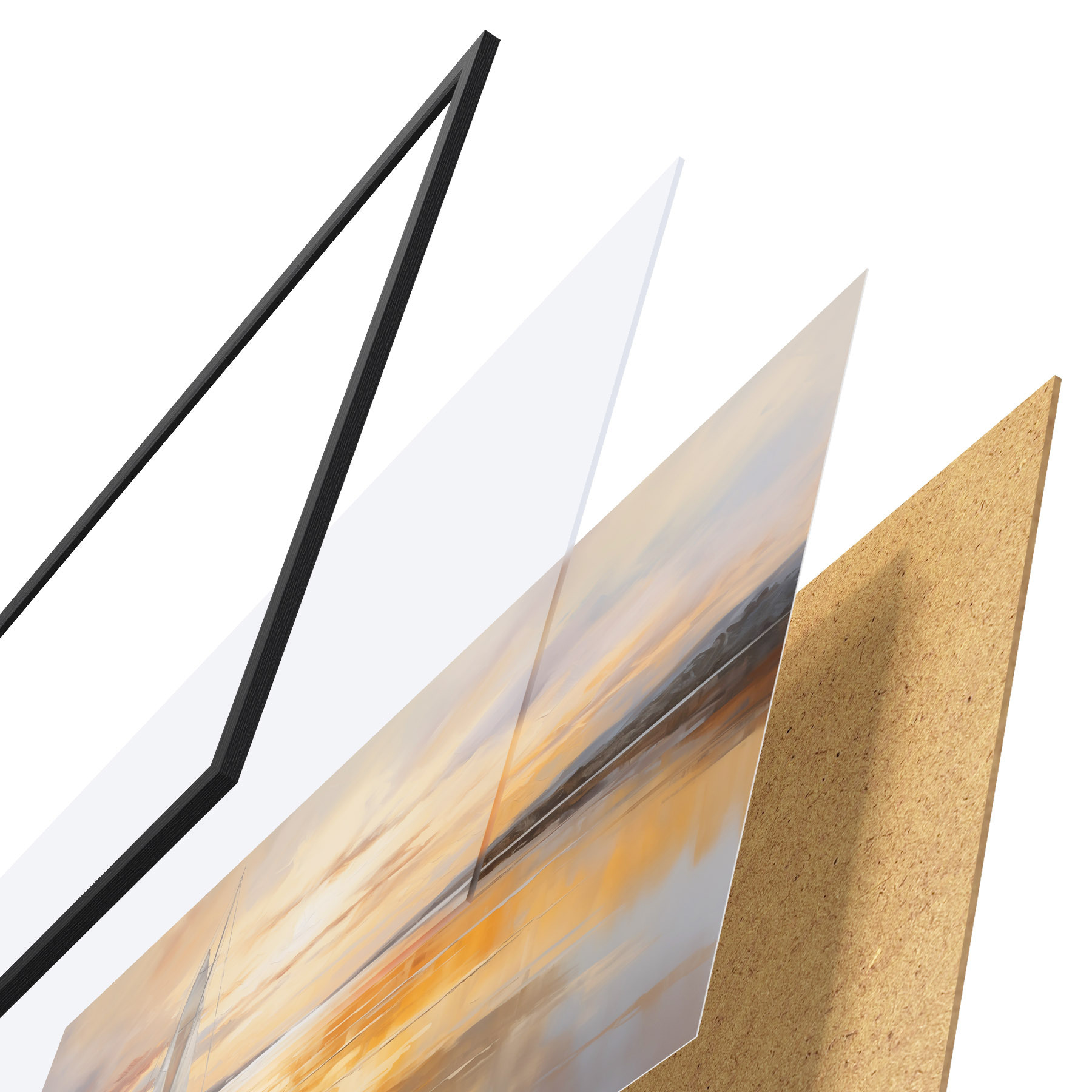 El póster consta de marco, plexiglás, imagen impresa y soporte de aglomerado. El póster puede colgarse inmediatamente en la pared gracias a los soportes de la parte posterior.