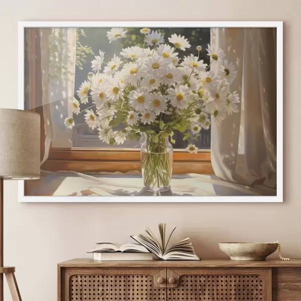 Poster Pintura al óleo imitación de un jarrón con margaritas blancas en el alféizar de una ventana, día soleado, paleta de colores cálidos Nr f43171