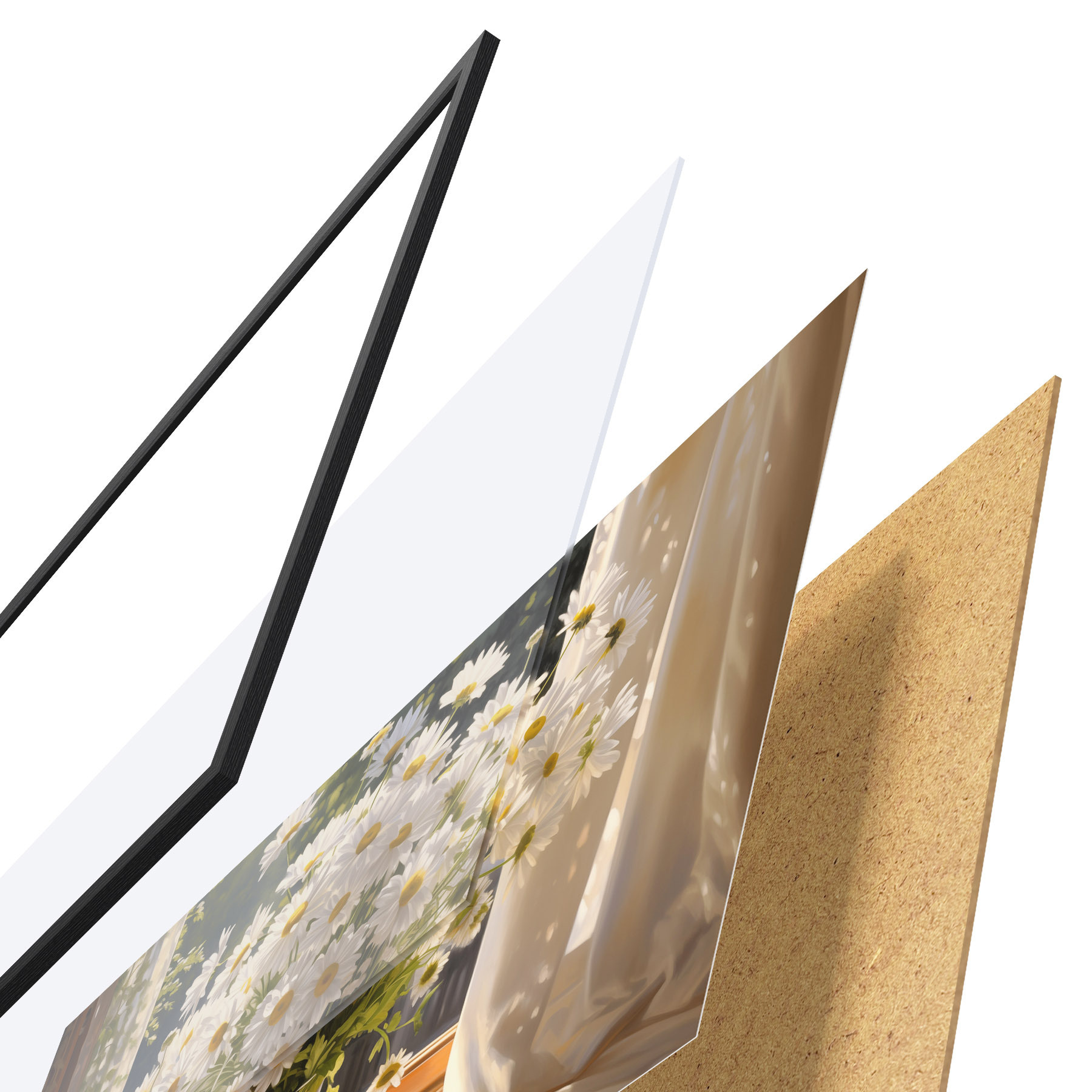 El póster consta de marco, plexiglás, imagen impresa y soporte de aglomerado. El póster puede colgarse inmediatamente en la pared gracias a los soportes de la parte posterior.