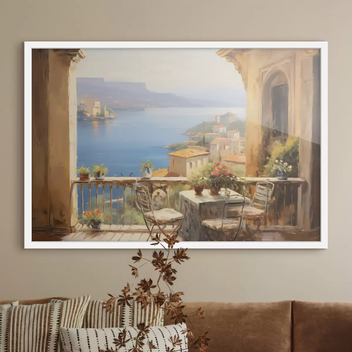 Poster Pintura al óleo imitación de balcón con flores, con vistas al mar, casas en la costa, día soleado, cielo azul Nr f43173