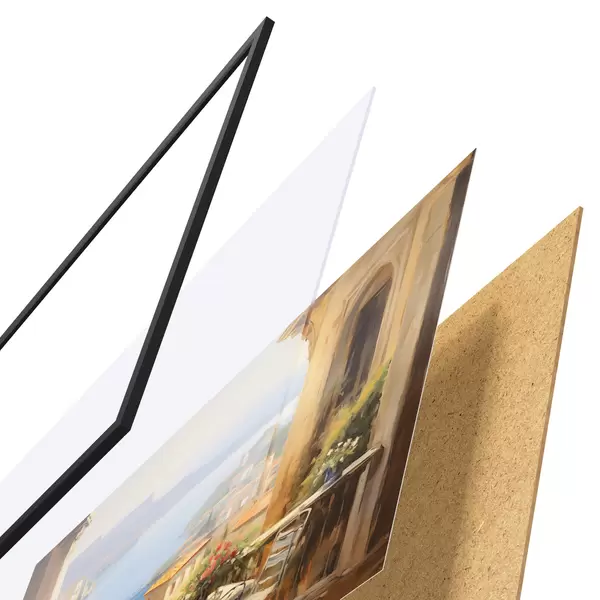 El póster consta de marco, plexiglás, imagen impresa y soporte de aglomerado. El póster puede colgarse inmediatamente en la pared gracias a los soportes de la parte posterior.