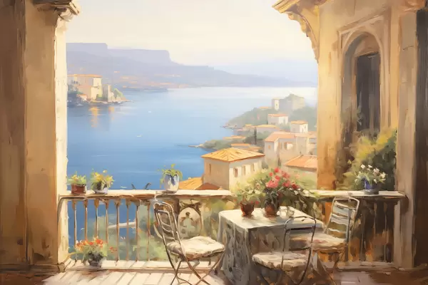 Poster Pintura al óleo imitación de balcón con flores, con vistas al mar, casas en la costa, día soleado, cielo azul Nr f43173
