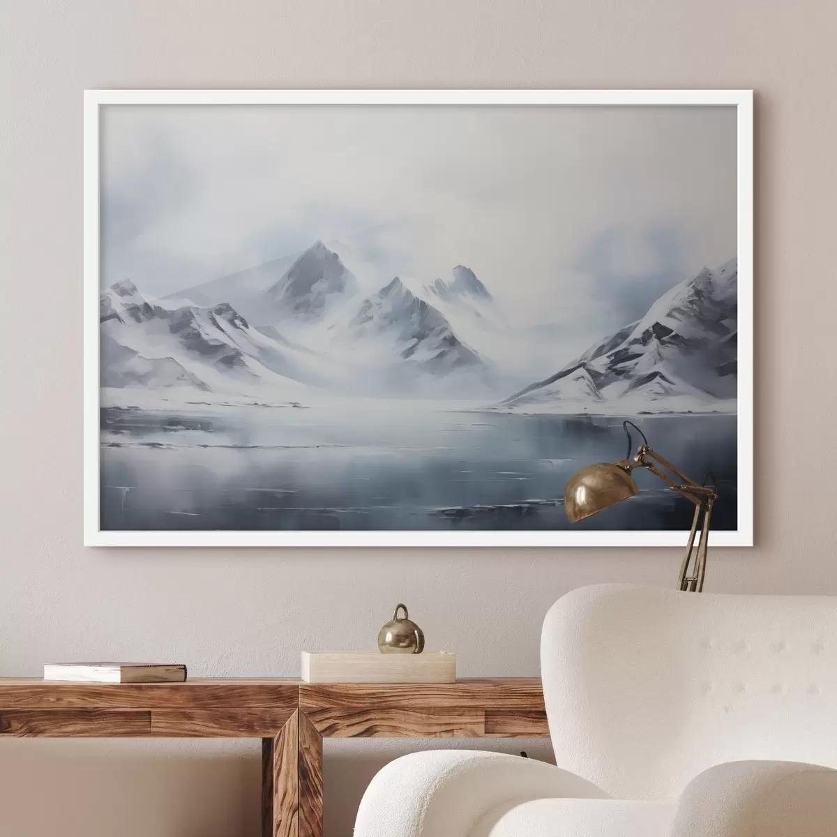 Poster Paisaje de montañas nevadas con un lago en primer plano, los picos están cubiertos de nieve y el cielo está nublado f43174