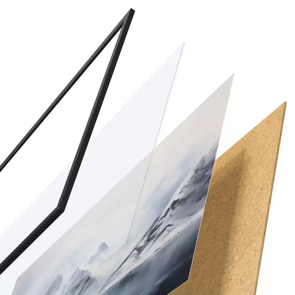 El póster consta de marco, plexiglás, imagen impresa y soporte de aglomerado. El póster puede colgarse inmediatamente en la pared gracias a los soportes de la parte posterior.