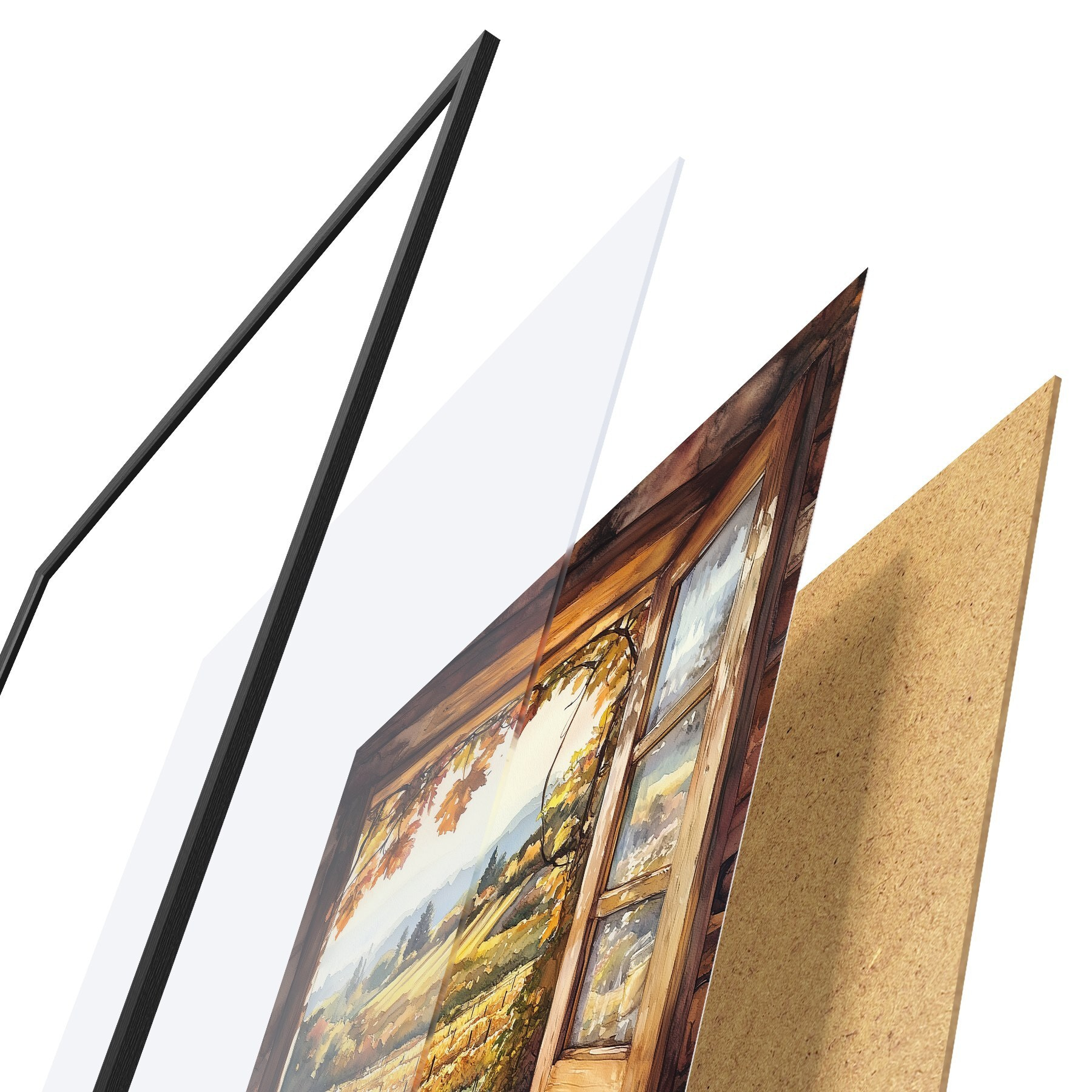 El póster consta de marco, plexiglás, imagen impresa y soporte de aglomerado. El póster puede colgarse inmediatamente en la pared gracias a los soportes de la parte posterior.