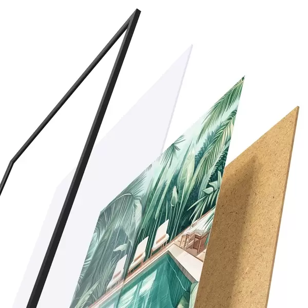 El póster consta de marco, plexiglás, imagen impresa y soporte de aglomerado. El póster puede colgarse inmediatamente en la pared gracias a los soportes de la parte posterior.