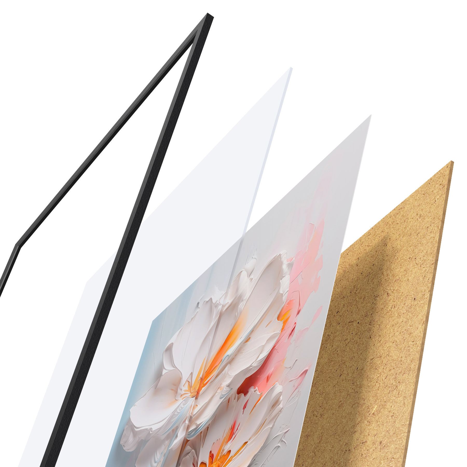El póster consta de marco, plexiglás, imagen impresa y soporte de aglomerado. El póster puede colgarse inmediatamente en la pared gracias a los soportes de la parte posterior.
