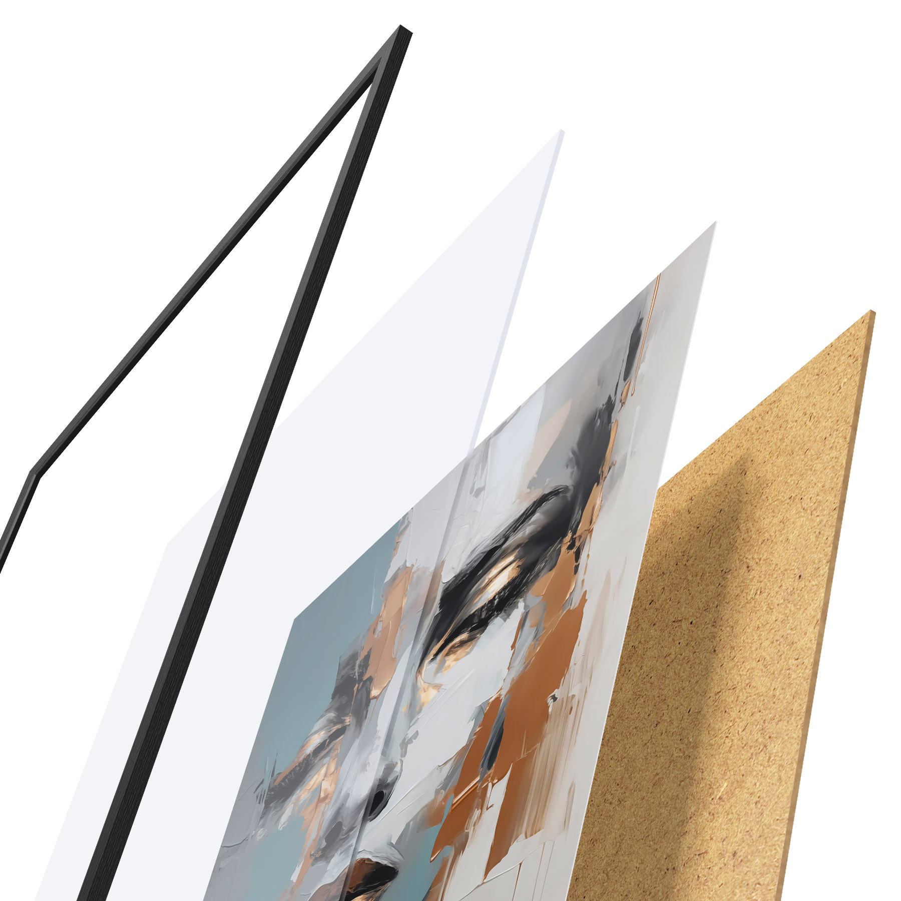 El póster consta de marco, plexiglás, imagen impresa y soporte de aglomerado. El póster puede colgarse inmediatamente en la pared gracias a los soportes de la parte posterior.