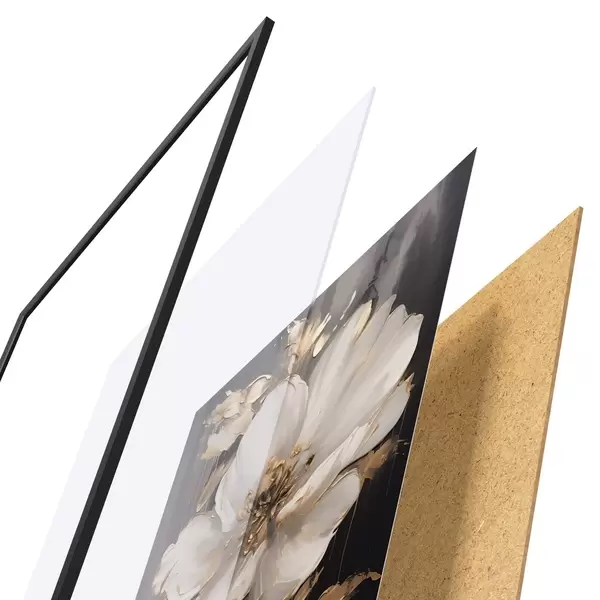 El póster consta de marco, plexiglás, imagen impresa y soporte de aglomerado. El póster puede colgarse inmediatamente en la pared gracias a los soportes de la parte posterior.