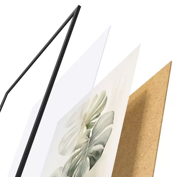 El póster consta de marco, plexiglás, imagen impresa y soporte de aglomerado. El póster puede colgarse inmediatamente en la pared gracias a los soportes de la parte posterior.