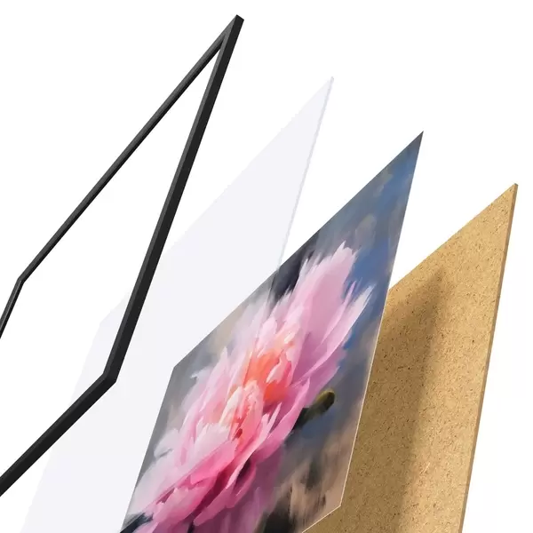 El póster consta de marco, plexiglás, imagen impresa y soporte de aglomerado. El póster puede colgarse inmediatamente en la pared gracias a los soportes de la parte posterior.