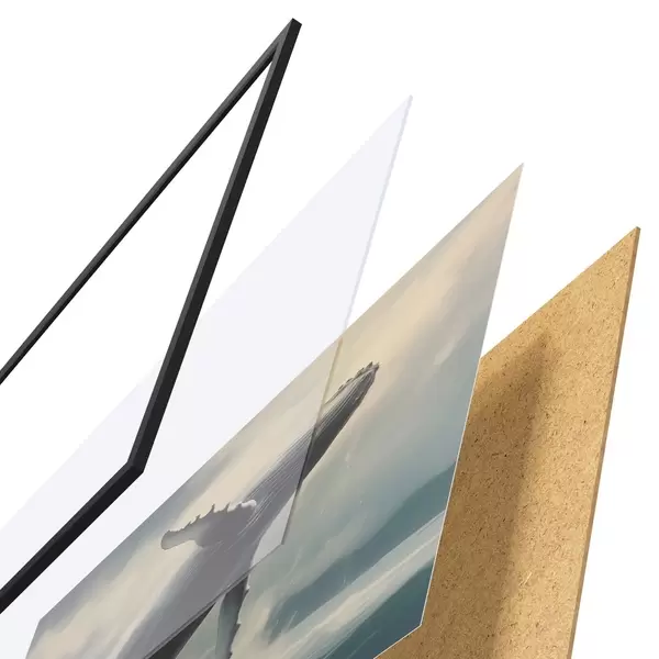 El póster consta de marco, plexiglás, imagen impresa y soporte de aglomerado. El póster puede colgarse inmediatamente en la pared gracias a los soportes de la parte posterior.