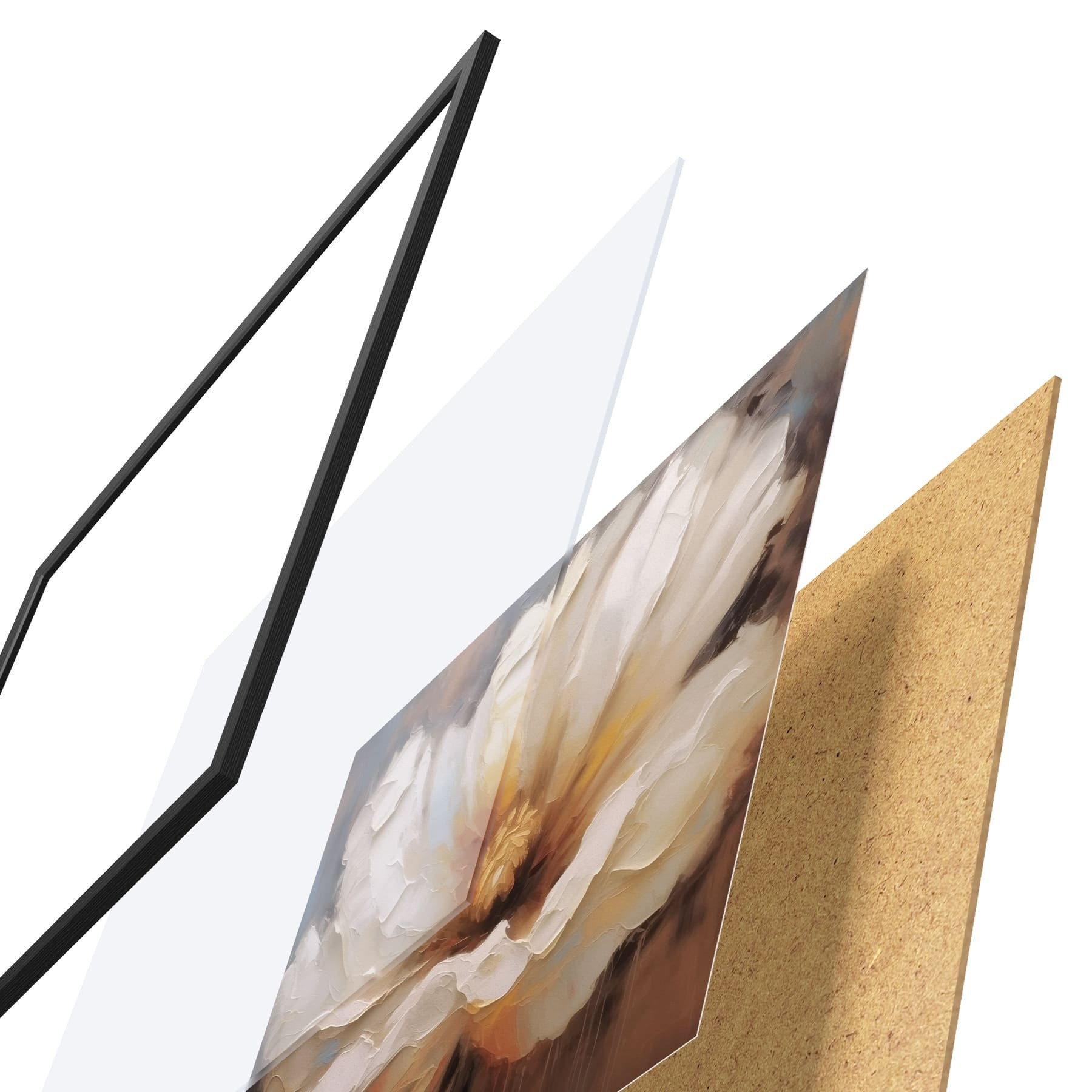 El póster consta de marco, plexiglás, imagen impresa y soporte de aglomerado. El póster puede colgarse inmediatamente en la pared gracias a los soportes de la parte posterior.