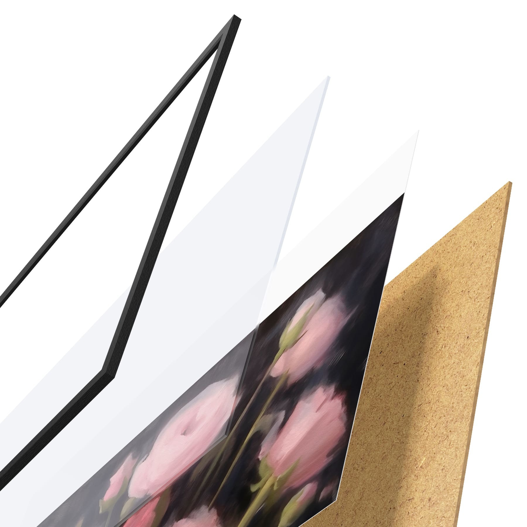 El póster consta de marco, plexiglás, imagen impresa y soporte de aglomerado. El póster puede colgarse inmediatamente en la pared gracias a los soportes de la parte posterior.