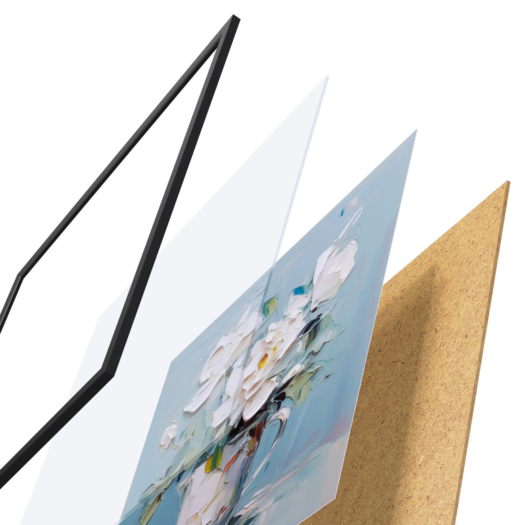 El póster consta de marco, plexiglás, imagen impresa y soporte de aglomerado. El póster puede colgarse inmediatamente en la pared gracias a los soportes de la parte posterior.