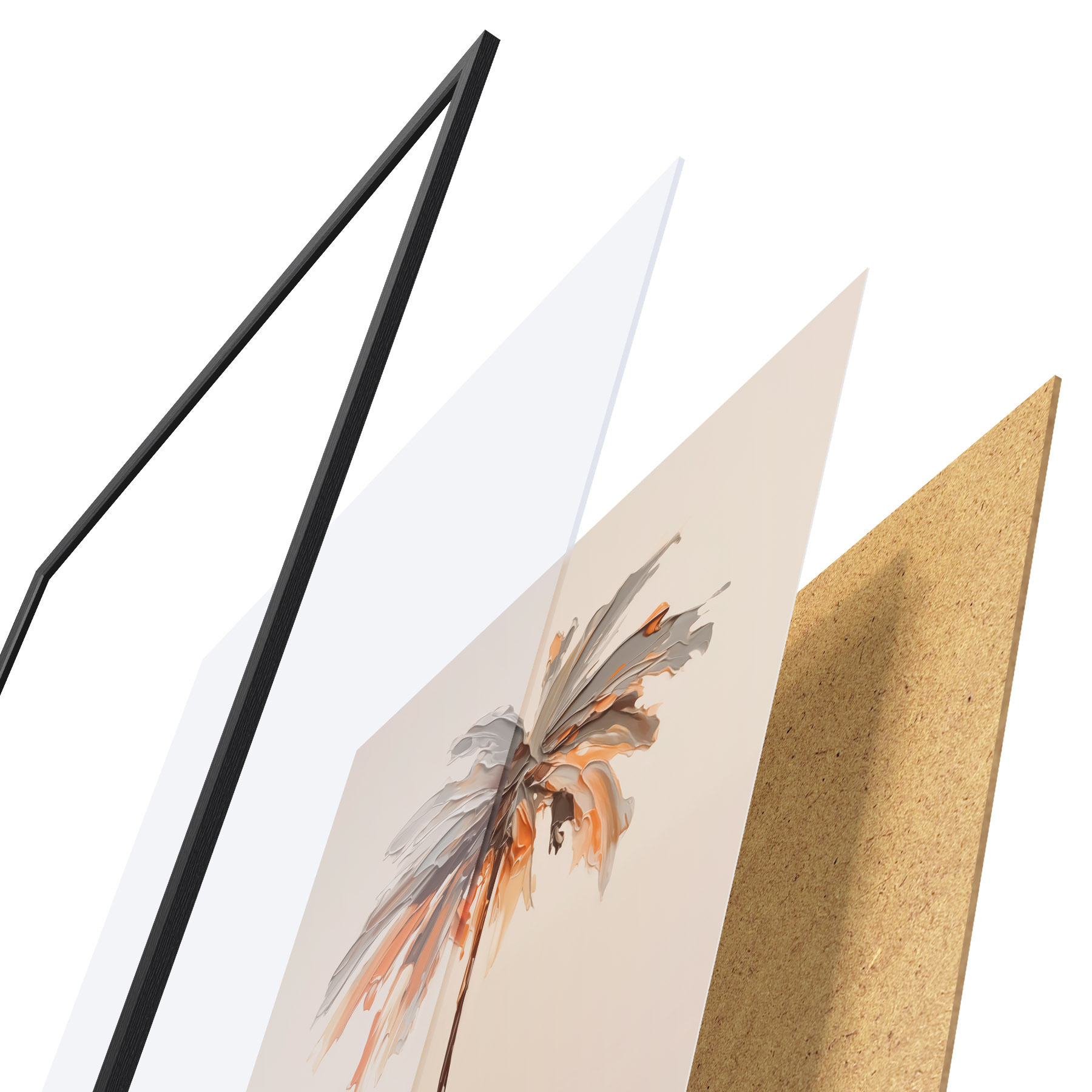 El póster consta de marco, plexiglás, imagen impresa y soporte de aglomerado. El póster puede colgarse inmediatamente en la pared gracias a los soportes de la parte posterior.