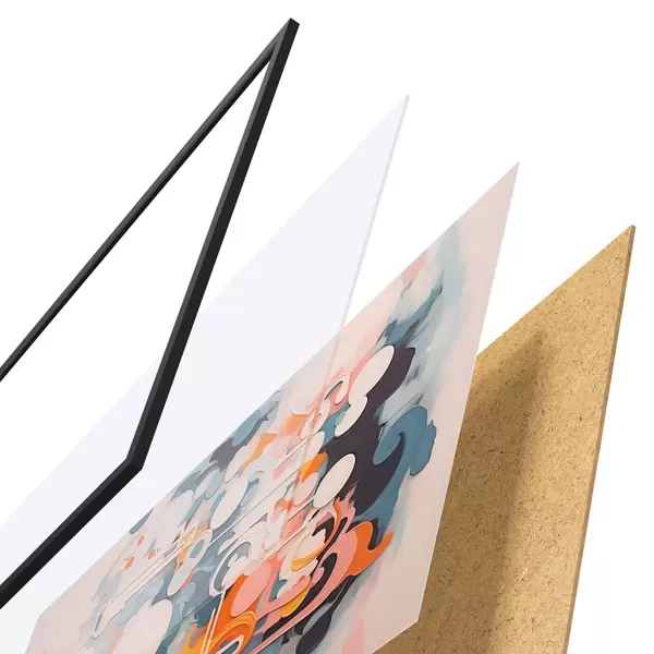 El póster consta de marco, plexiglás, imagen impresa y soporte de aglomerado. El póster puede colgarse inmediatamente en la pared gracias a los soportes de la parte posterior.