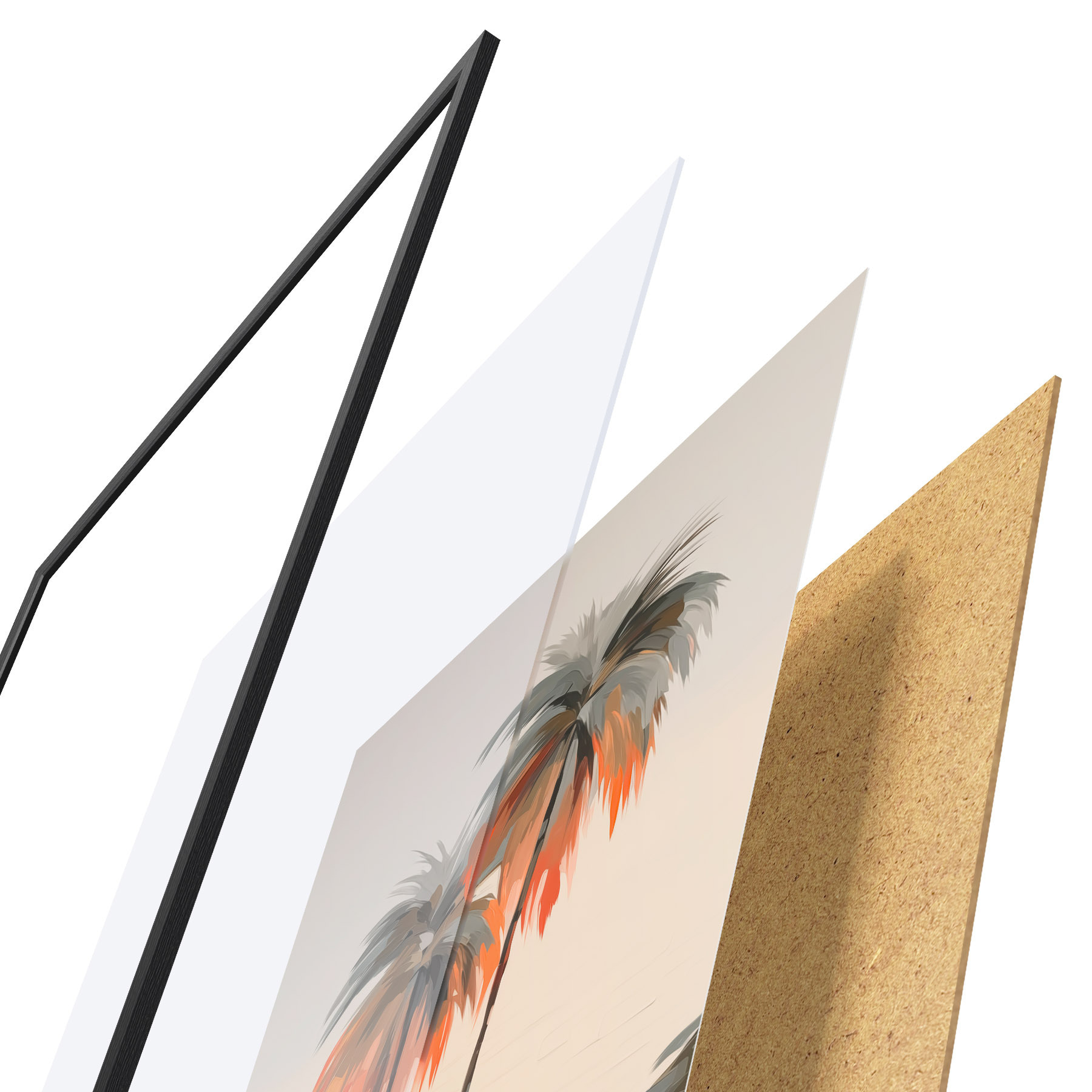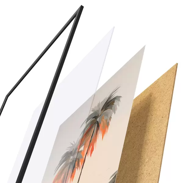 El póster consta de marco, plexiglás, imagen impresa y soporte de aglomerado. El póster puede colgarse inmediatamente en la pared gracias a los soportes de la parte posterior.