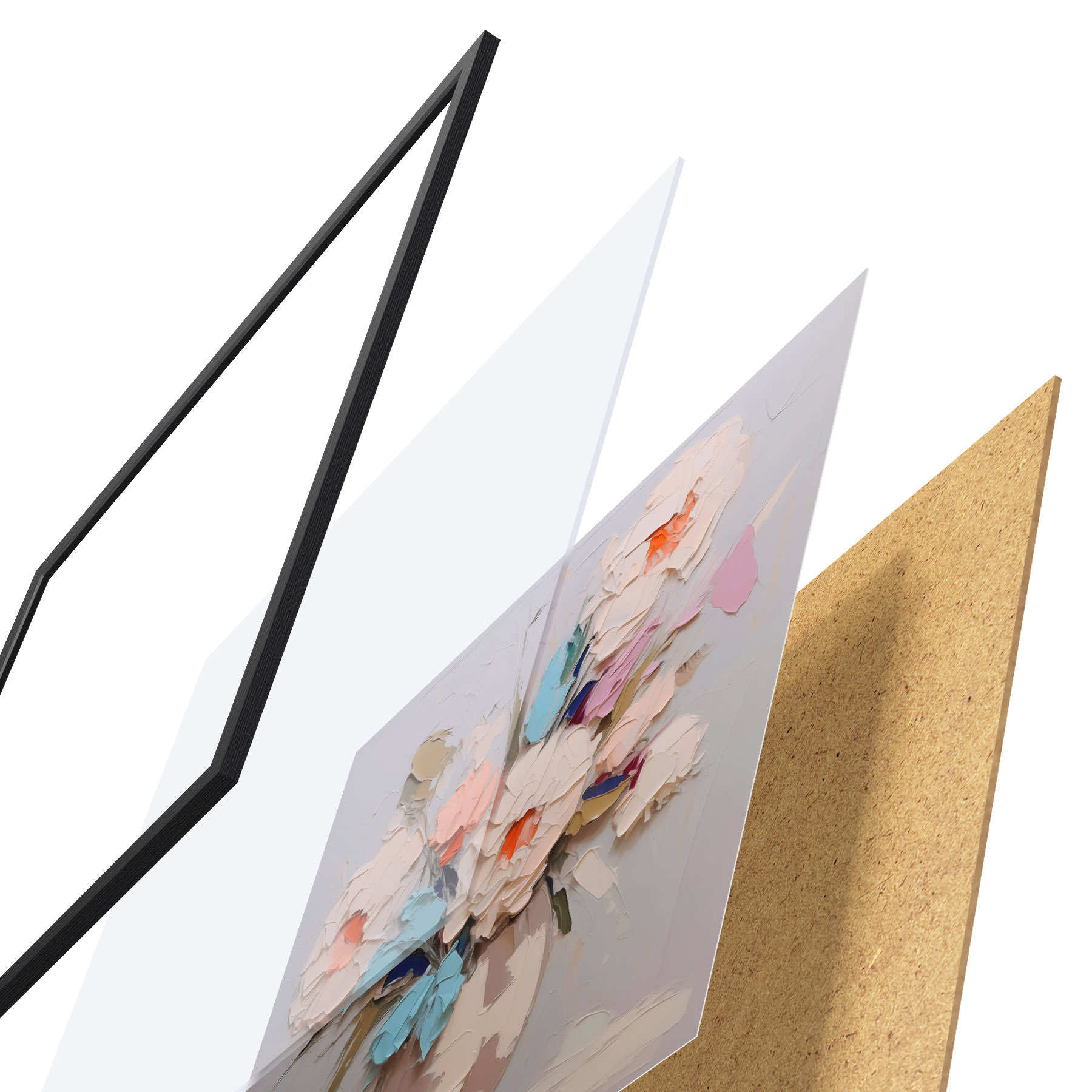 El póster consta de marco, plexiglás, imagen impresa y soporte de aglomerado. El póster puede colgarse inmediatamente en la pared gracias a los soportes de la parte posterior.