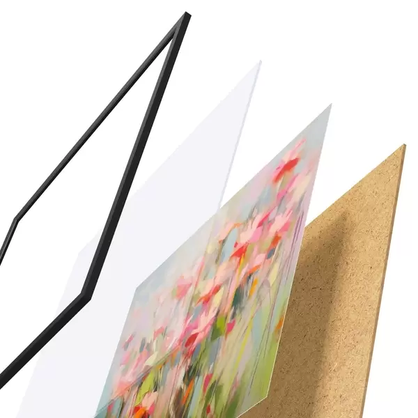 El póster consta de marco, plexiglás, imagen impresa y soporte de aglomerado. El póster puede colgarse inmediatamente en la pared gracias a los soportes de la parte posterior.