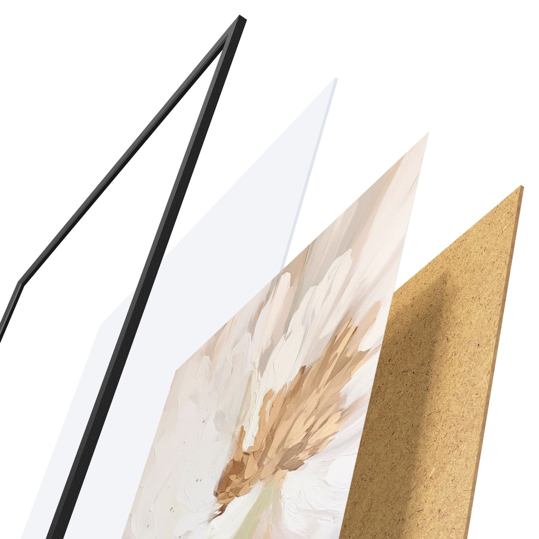 El póster consta de marco, plexiglás, imagen impresa y soporte de aglomerado. El póster puede colgarse inmediatamente en la pared gracias a los soportes de la parte posterior.