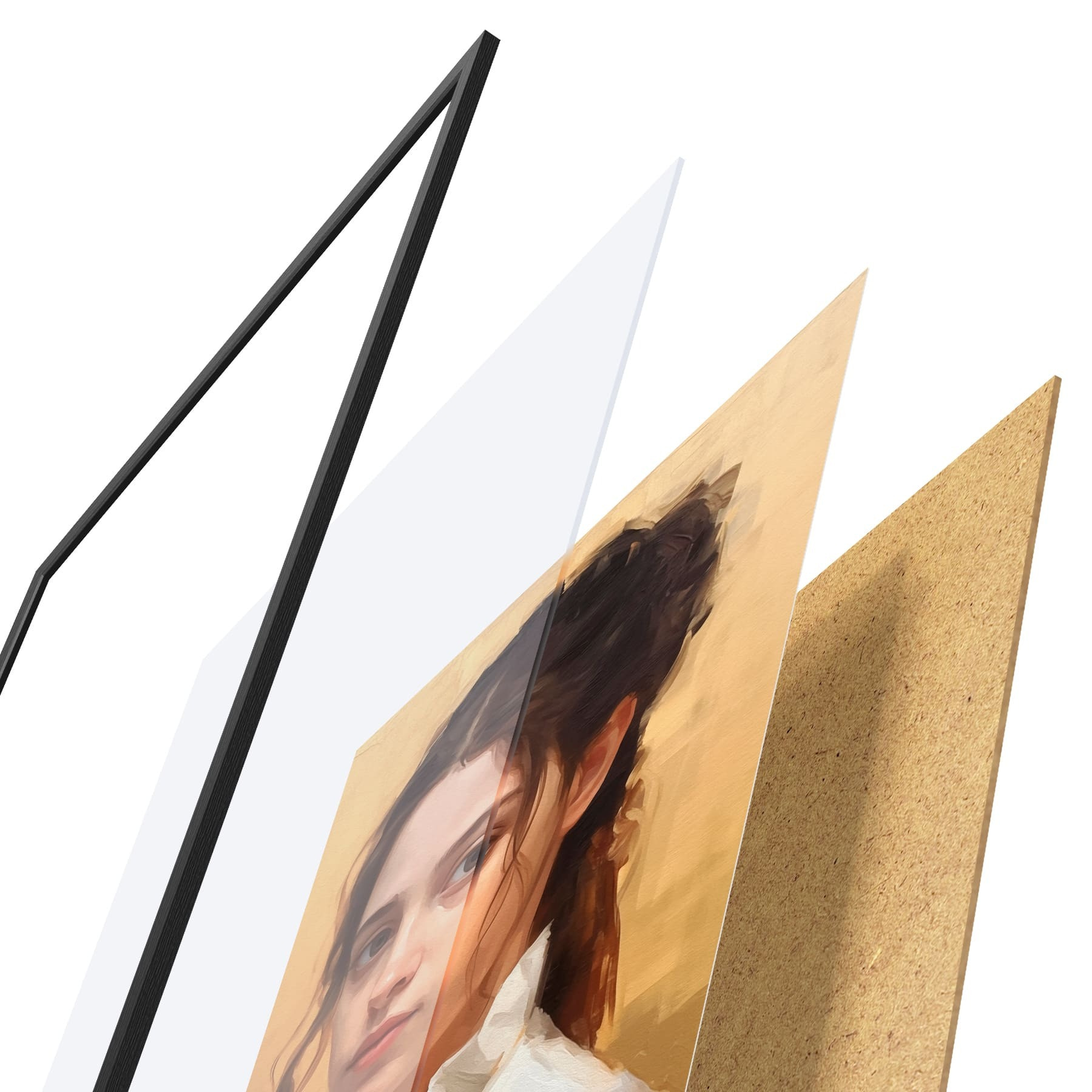 El póster consta de marco, plexiglás, imagen impresa y soporte de aglomerado. El póster puede colgarse inmediatamente en la pared gracias a los soportes de la parte posterior.