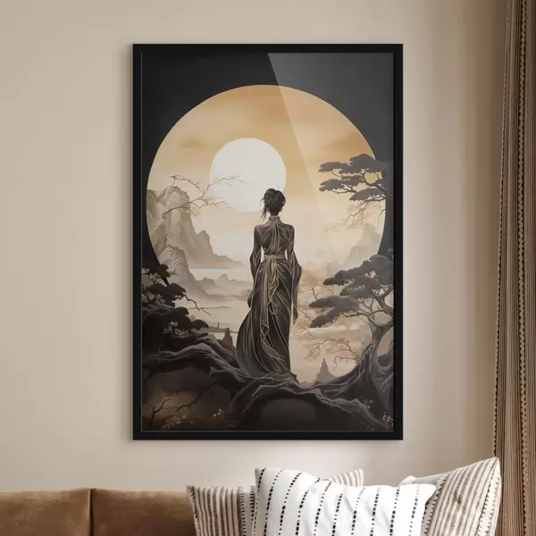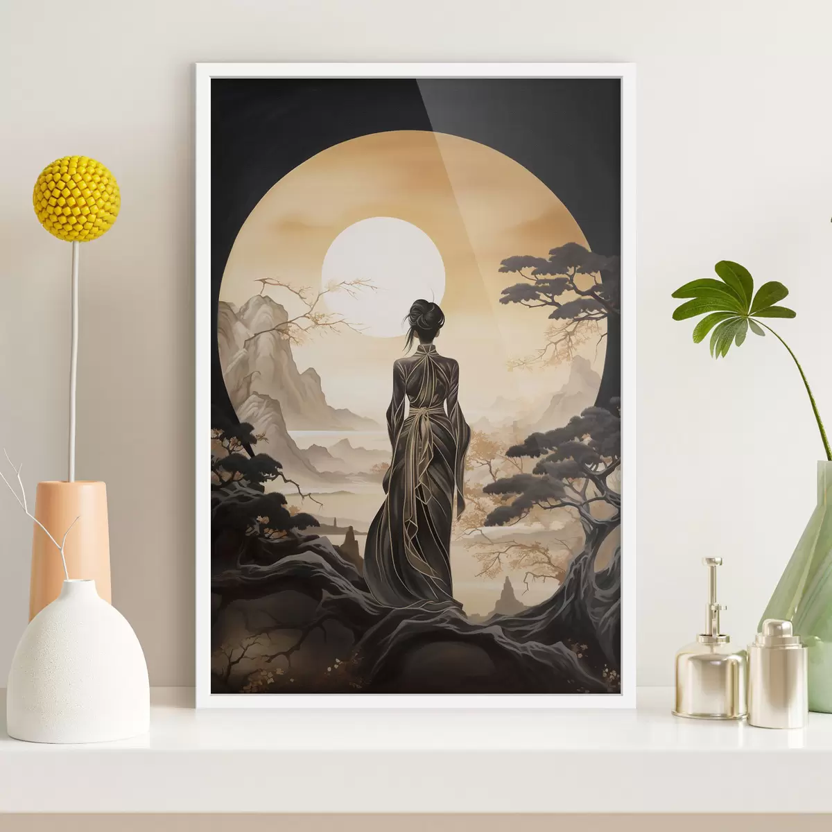 Poster Gente, Japón, chica al atardecer sobre el fondo de sakura y montañas Nr f43256