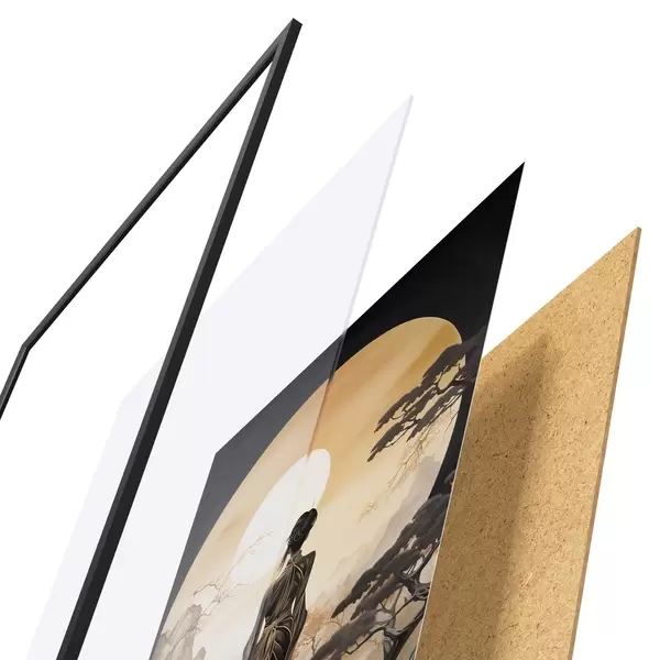 El póster consta de marco, plexiglás, imagen impresa y soporte de aglomerado. El póster puede colgarse inmediatamente en la pared gracias a los soportes de la parte posterior.
