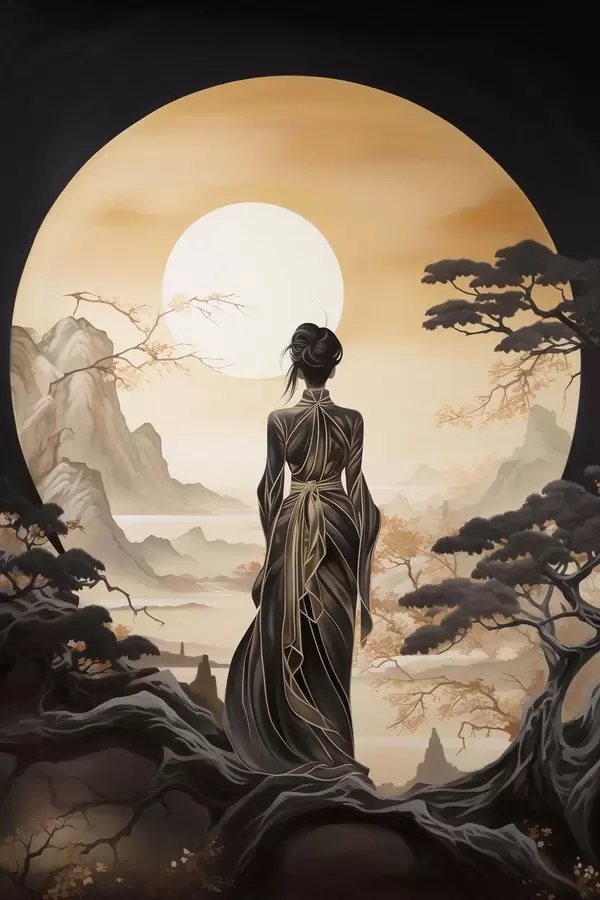 Poster Gente, Japón, chica al atardecer sobre el fondo de sakura y montañas Nr f43256