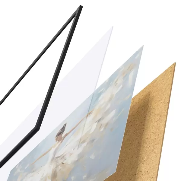 El póster consta de marco, plexiglás, imagen impresa y soporte de aglomerado. El póster puede colgarse inmediatamente en la pared gracias a los soportes de la parte posterior.