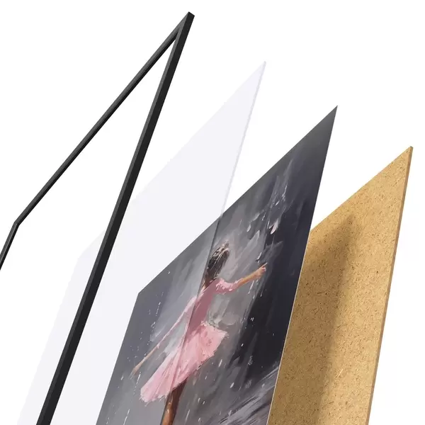 El póster consta de marco, plexiglás, imagen impresa y soporte de aglomerado. El póster puede colgarse inmediatamente en la pared gracias a los soportes de la parte posterior.