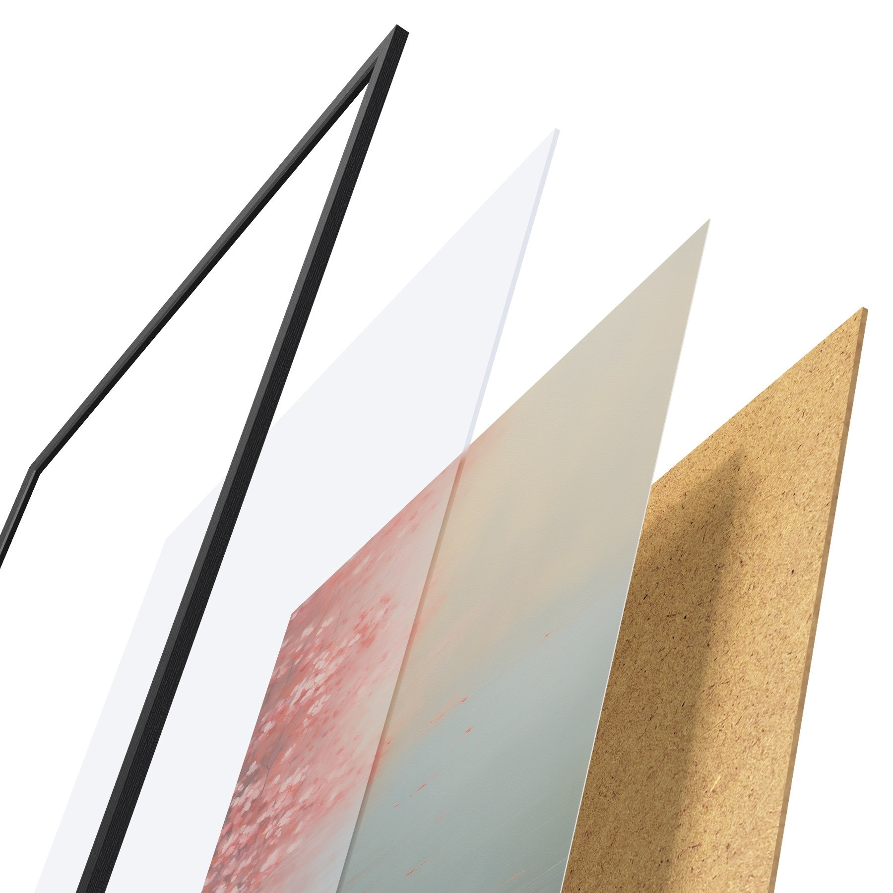 El póster consta de marco, plexiglás, imagen impresa y soporte de aglomerado. El póster puede colgarse inmediatamente en la pared gracias a los soportes de la parte posterior.