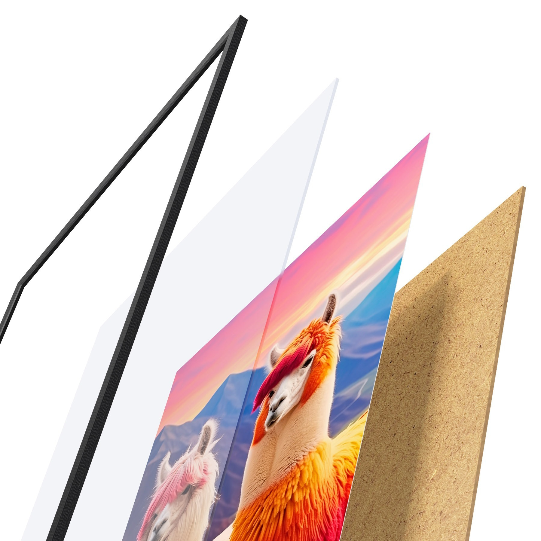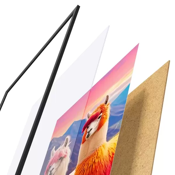 El póster consta de marco, plexiglás, imagen impresa y soporte de aglomerado. El póster puede colgarse inmediatamente en la pared gracias a los soportes de la parte posterior.