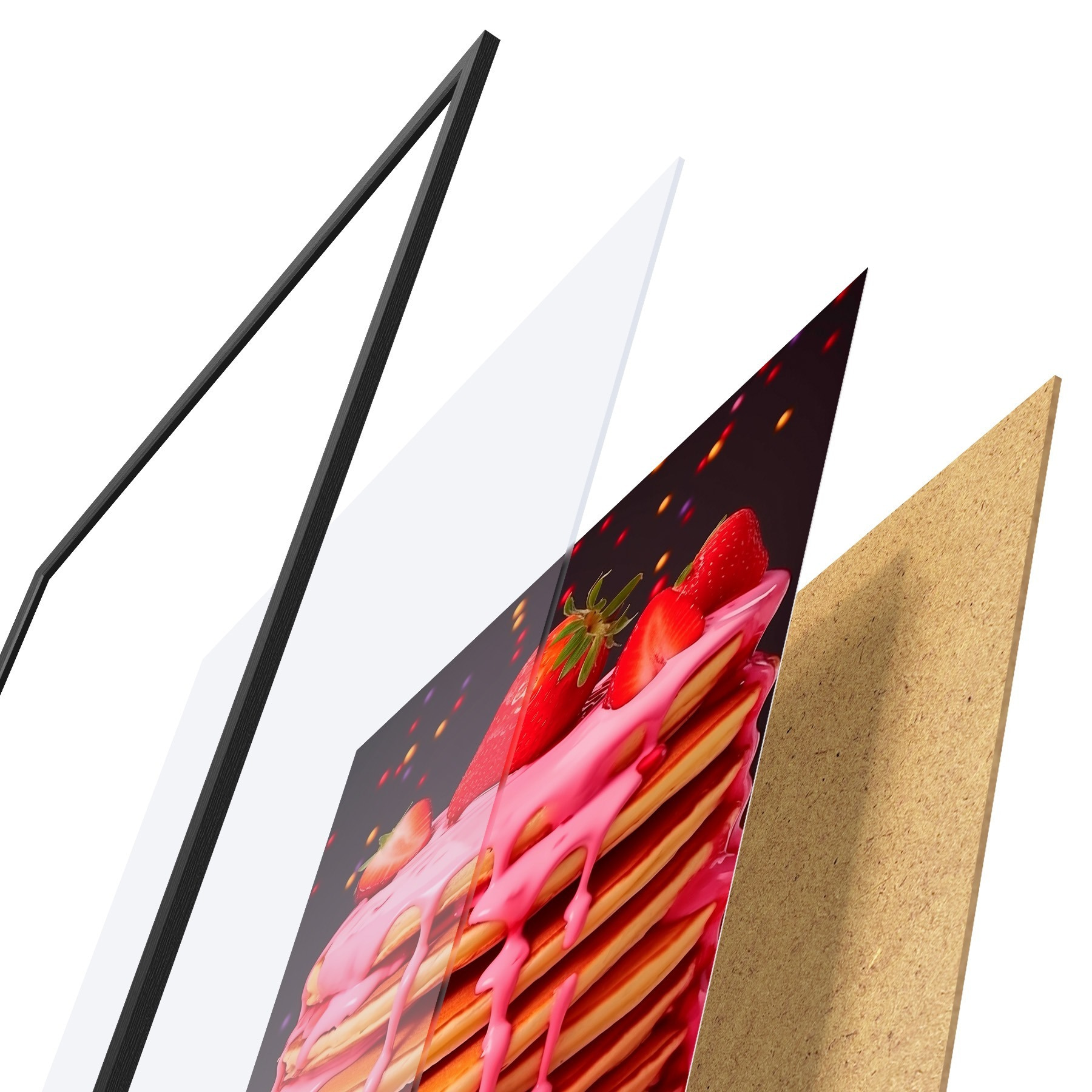 El póster consta de marco, plexiglás, imagen impresa y soporte de aglomerado. El póster puede colgarse inmediatamente en la pared gracias a los soportes de la parte posterior.