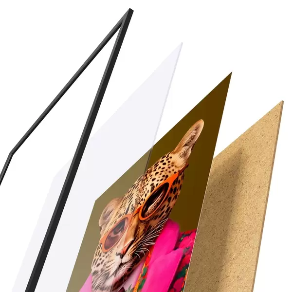 El póster consta de marco, plexiglás, imagen impresa y soporte de aglomerado. El póster puede colgarse inmediatamente en la pared gracias a los soportes de la parte posterior.