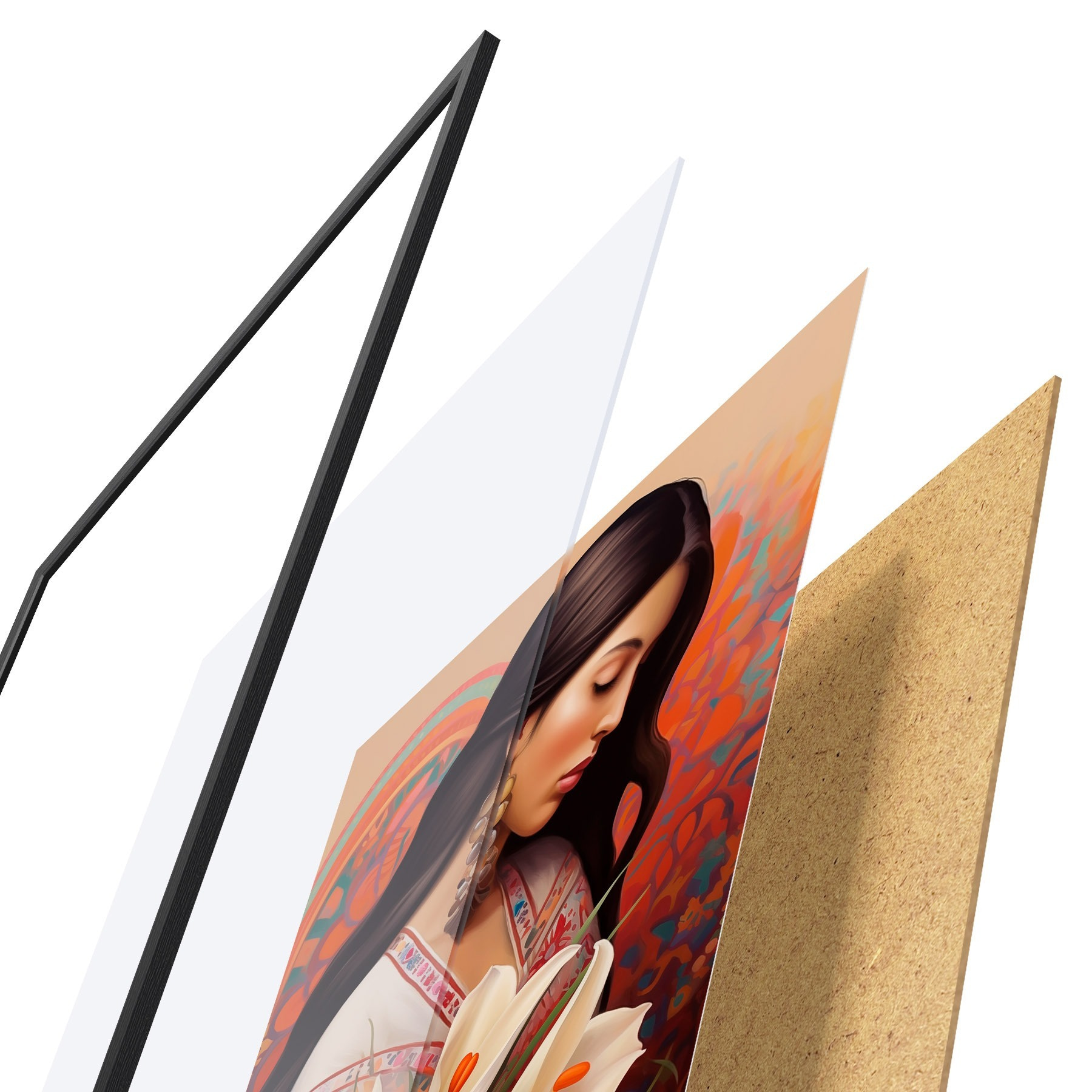 El póster consta de marco, plexiglás, imagen impresa y soporte de aglomerado. El póster puede colgarse inmediatamente en la pared gracias a los soportes de la parte posterior.