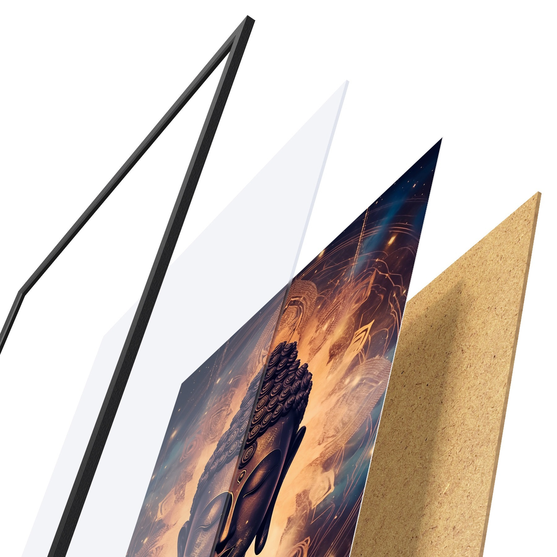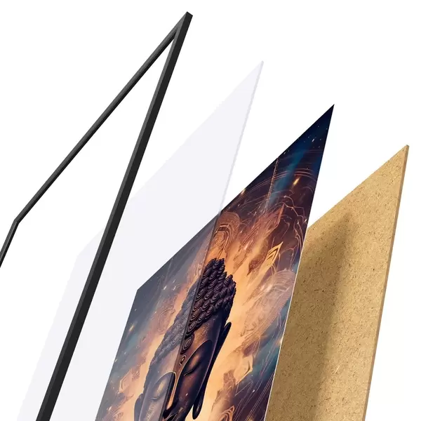 El póster consta de marco, plexiglás, imagen impresa y soporte de aglomerado. El póster puede colgarse inmediatamente en la pared gracias a los soportes de la parte posterior.