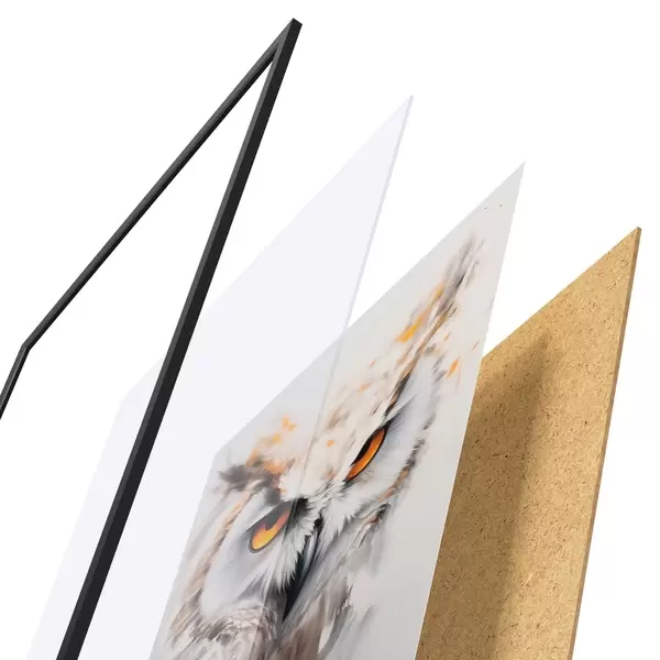 El póster consta de marco, plexiglás, imagen impresa y soporte de aglomerado. El póster puede colgarse inmediatamente en la pared gracias a los soportes de la parte posterior.