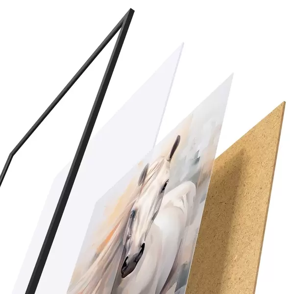 El póster consta de marco, plexiglás, imagen impresa y soporte de aglomerado. El póster puede colgarse inmediatamente en la pared gracias a los soportes de la parte posterior.