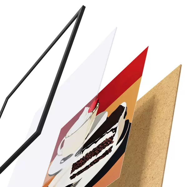 El póster consta de marco, plexiglás, imagen impresa y soporte de aglomerado. El póster puede colgarse inmediatamente en la pared gracias a los soportes de la parte posterior.