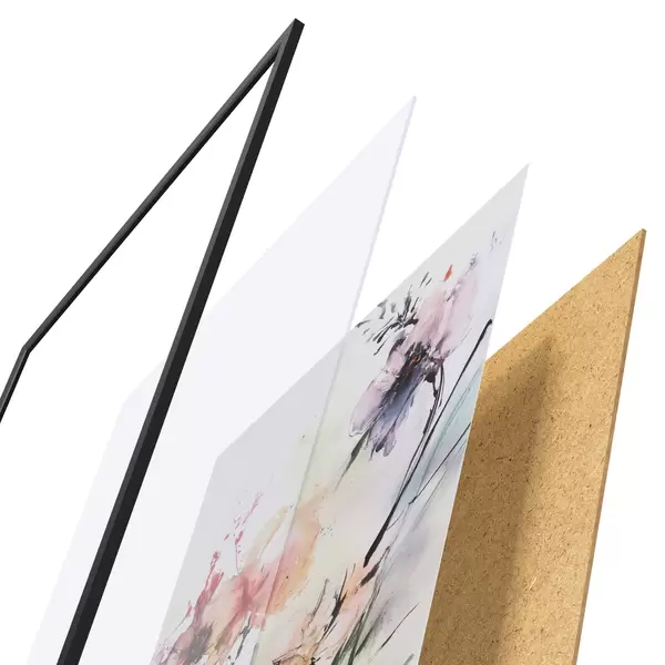 El póster consta de marco, plexiglás, imagen impresa y soporte de aglomerado. El póster puede colgarse inmediatamente en la pared gracias a los soportes de la parte posterior.