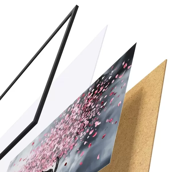 El póster consta de marco, plexiglás, imagen impresa y soporte de aglomerado. El póster puede colgarse inmediatamente en la pared gracias a los soportes de la parte posterior.