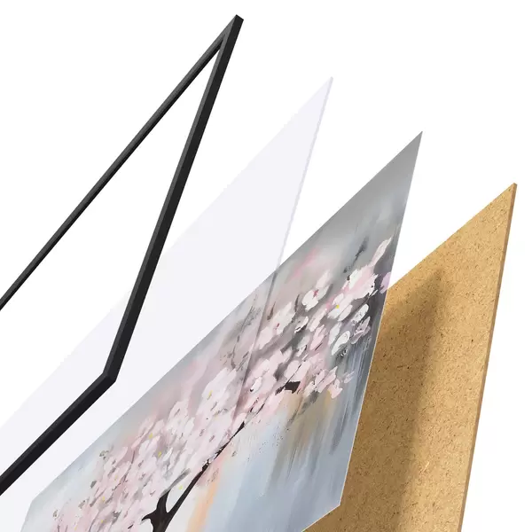 El póster consta de marco, plexiglás, imagen impresa y soporte de aglomerado. El póster puede colgarse inmediatamente en la pared gracias a los soportes de la parte posterior.