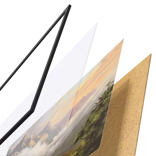 El póster consta de marco, plexiglás, imagen impresa y soporte de aglomerado. El póster puede colgarse inmediatamente en la pared gracias a los soportes de la parte posterior.